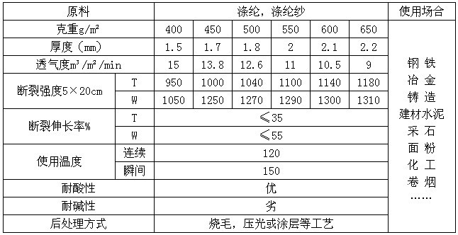 滌綸針刺過濾氈是制做常溫除塵布袋的理想材料,滌綸針刺氈采用中石化化生產的高標準滌綸纖維,按照國標GB12625-90標準生產,加工制作的過濾材料,為常溫過濾材料的主要品種。滌綸又稱聚酯,無論在干、濕性狀態下變化不大。它對絕大部分常溫中的氛圍提供良好的抵抗力。適應場合: