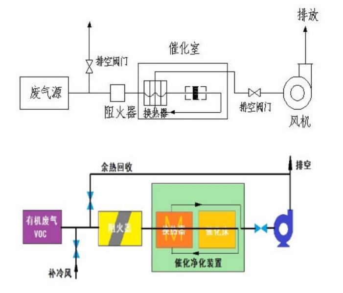 催化氧化技術(Catalytic Oxidizer,簡稱CO),通常是指將廢氣加熱到280℃以上,在催化劑的作用下將廢氣分解成CO2和和H2O,催化產生的高溫熱量被板式換熱器進行循環熱交換,從而節省運行能耗的一種VOCs治理技術。