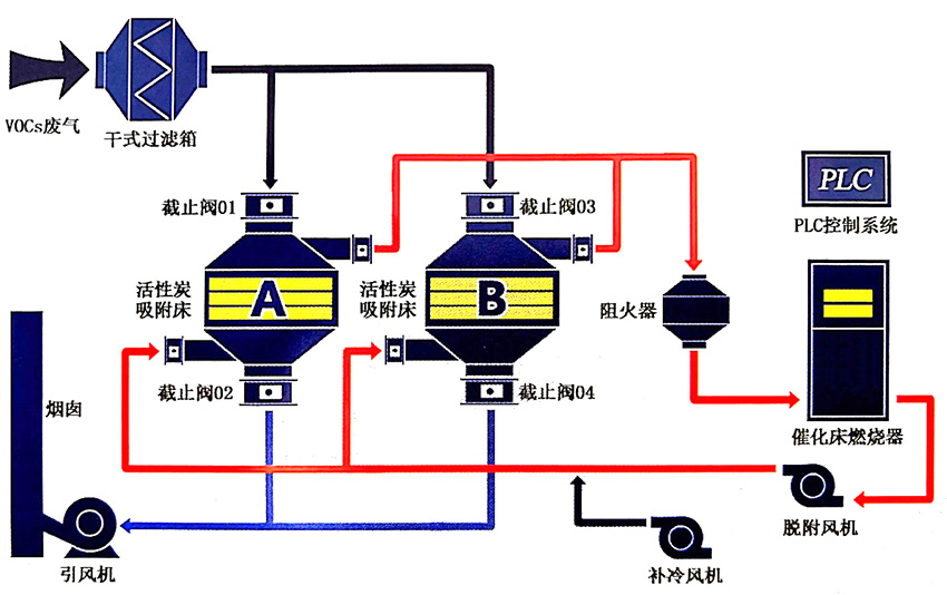活性炭吸附+催化燃燒脫附裝置,是采用催化燃燒活性炭脫附,將大風量低濃度的有機溶劑吸附到活性炭中,經催化燃燒將含溶劑活性炭加熱到沸點,通過催化劑的氧化燃燒反應,將炭中物質轉化為無害的水和二氧化碳排入大氣,并且能解決活性炭脫附的二次污染。如果VOCs廢氣濃度低于1000g/m,出口溫度低于45℃,其性質屬于低濃度廢氣,因此選擇活性炭吸附-催化燃燒脫附較為理想。