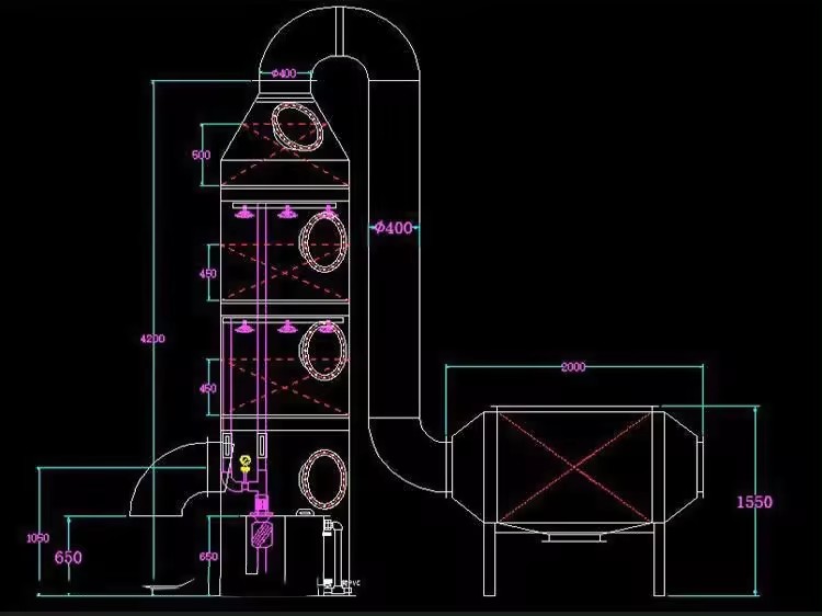 廢氣由風(fēng)機(jī)引入噴淋塔,內(nèi)筒形成壓力室,壓力室均勻分布到每個(gè)鼓泡管。廢氣通過(guò)鼓泡管,進(jìn)入液體吸收罐吸收鼓泡液體,然后氣泡通過(guò)填料層。氣-液兩相與吸收中和反應(yīng)完全接觸。水經(jīng)塔底的水泵加壓后噴在塔頂,最后返回塔底回收,并且吸收和過(guò)濾后的廢氣繼續(xù)向上流動(dòng)并被噴射。管子噴出的吸收中和液產(chǎn)生最終反應(yīng)。中和反應(yīng)后,末端除霧板脫水除塵后的氣體排入大氣,它也可以與光氧催化或低溫等離子體和活性炭氣體凈化設(shè)備結(jié)合使用。處理后廢氣達(dá)到地方或國(guó)家排放標(biāo)準(zhǔn)和排放要求