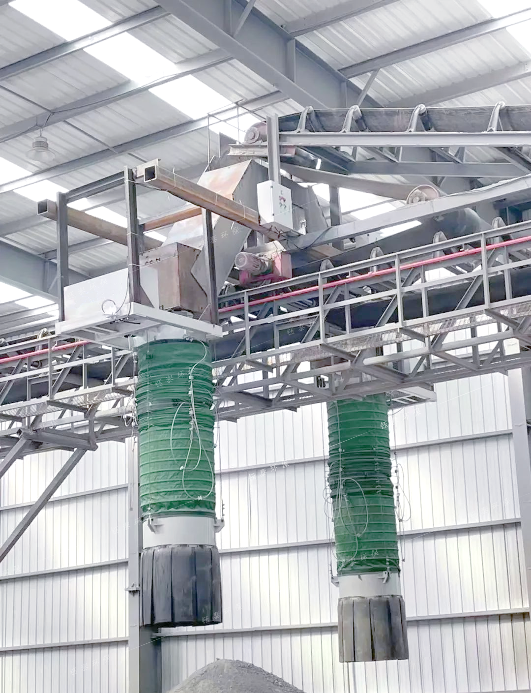 建材行業的砂石料皮帶輸送機卸料端的揚塵問題普遍存在,由于石料從高處的皮帶直接落在地上,其落差有3-5米高,有的甚至達到10米高,石料下落的過程中被風吹的滿天飛,不僅造成嚴重的環境污染,而且造成物料的浪費。